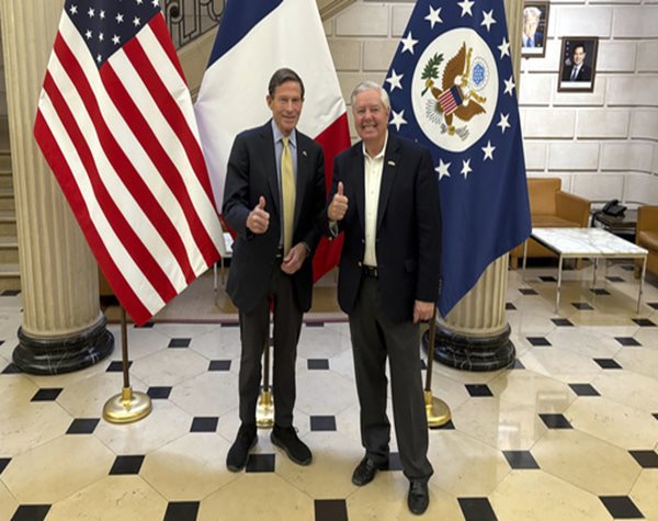 European leaders, including President Macron, express unity with U.S. senators in taking a stronger stance against Russia's aggression.